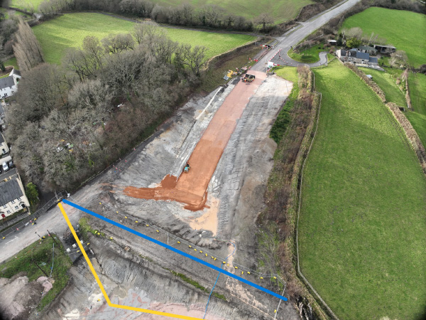 The drone image below shows the foundation in place to tie the new link road into the A382. The raised area in between is where South West Water will be diverting one of the water mains; they are currently working in another area. Once this is completed, this section of road will join up with the new roundabout. North to Drumbridges the blue line shows the existing water main, the yellow line shows where new diverted main will be positioned.