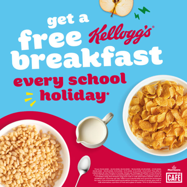 From Monday 16th February families visiting any Morrisons’ 343 Cafes across the country during school holidays will be able to request a free ‘Kellogg’s Breakfast’. This includes a bowl of Kellogg’s cereal (Rice Krispies or Corn Flakes), milk or a milk alternative, and an apple or banana. The offer is universally accessible, requires no signup, and meets school food standards.
