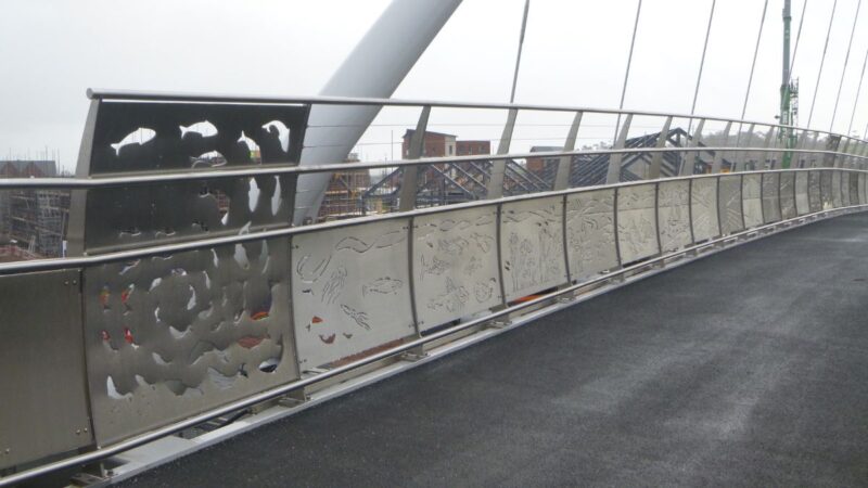 Isabel said: “This is my first steel artwork, and I’m really pleased with it. Each panel tells a different story but they are all linked with a ribbon design that’s like a breath of wind. As the light changes throughout the day, it changes the patterns and shadows that are cast on the ground, giving the images movement and ever changing interest. I hope lots of people enjoy it, especially schoolchildren that use the bridge, and I hope the bridge becomes a well-loved part of the new development.”