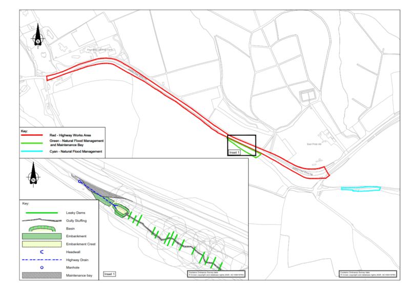 These essential works will reduce the frequency of flooding on the carriageway and minimise the damage caused during flooding, reducing the need for road closures to repair flood damage. Using a combination of traditional engineering and natural flood management, our works will include: