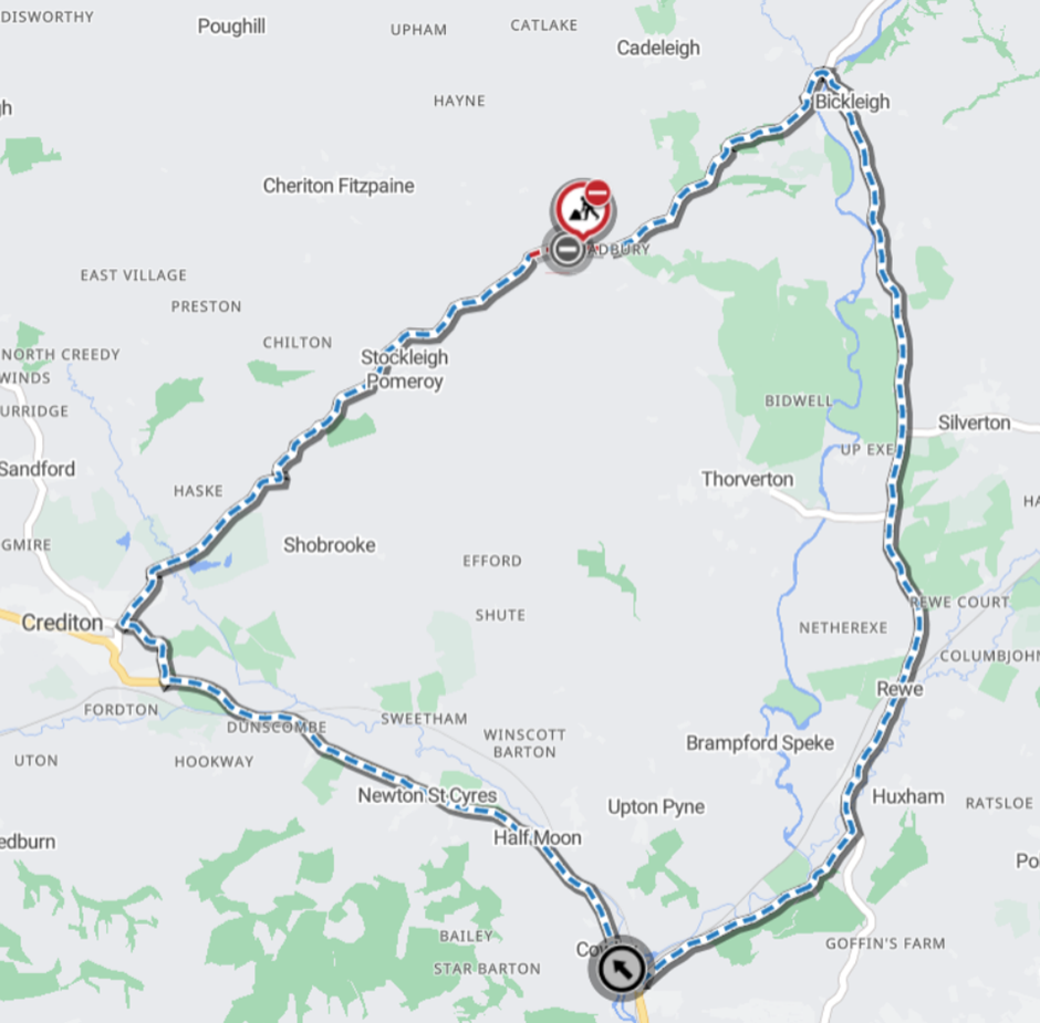 Diversion route for the roadworks on the A3072 Road from Coffintree Cross to Cadbury Cross.