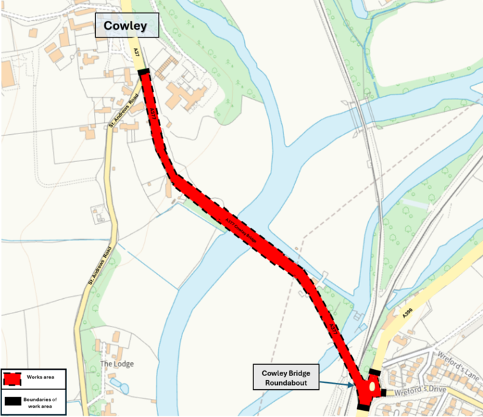 Essential resurfacing and lining works will take place on the A377 Cowley Bridge, from just north of the junction with St Andrews Road up to and including Cowley Bridge Roundabout, from Tuesday 10 March to Tuesday 24 March 2026.