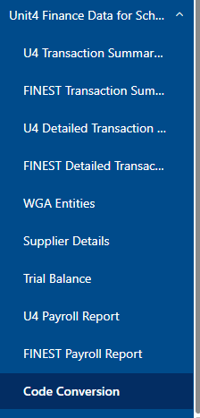 This feature can be accessed on the left hand menu, by clicking ‘Code Conversion’ under the heading ‘Unit 4 Finance Data for Schools’, please see screenshot below: