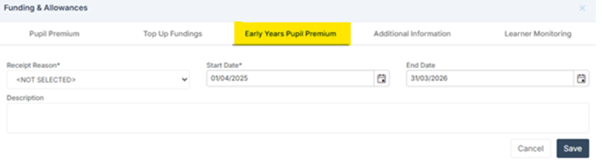 • click on Funding and Allowances, click on the Early Years Pupil Premium tab and enter the information here;