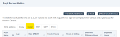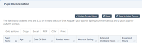 Once the EY funding items information is up to date and accurate, you will be able to run your census and enter the hours for the Early Years into the Pupil Reconciliation panel.  Please ensure all early years pupils are listed, as expected.