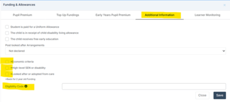 • click on Additional information and tick the relevant box for the basis for 2yr old funding.  There is also a field for the eligibility code to be entered.